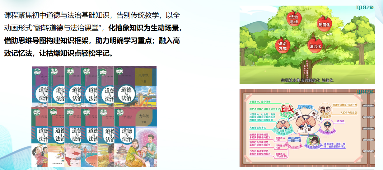 课程聚焦初中道德与法治基础知识,告别传统教学,以全动画形式“翻转道德与法治课堂”,化抽象知识为生动场景,借助思维导图构建知识框架,助力明确学习重点;融入高效记忆法,让枯燥知识点轻松牢记。